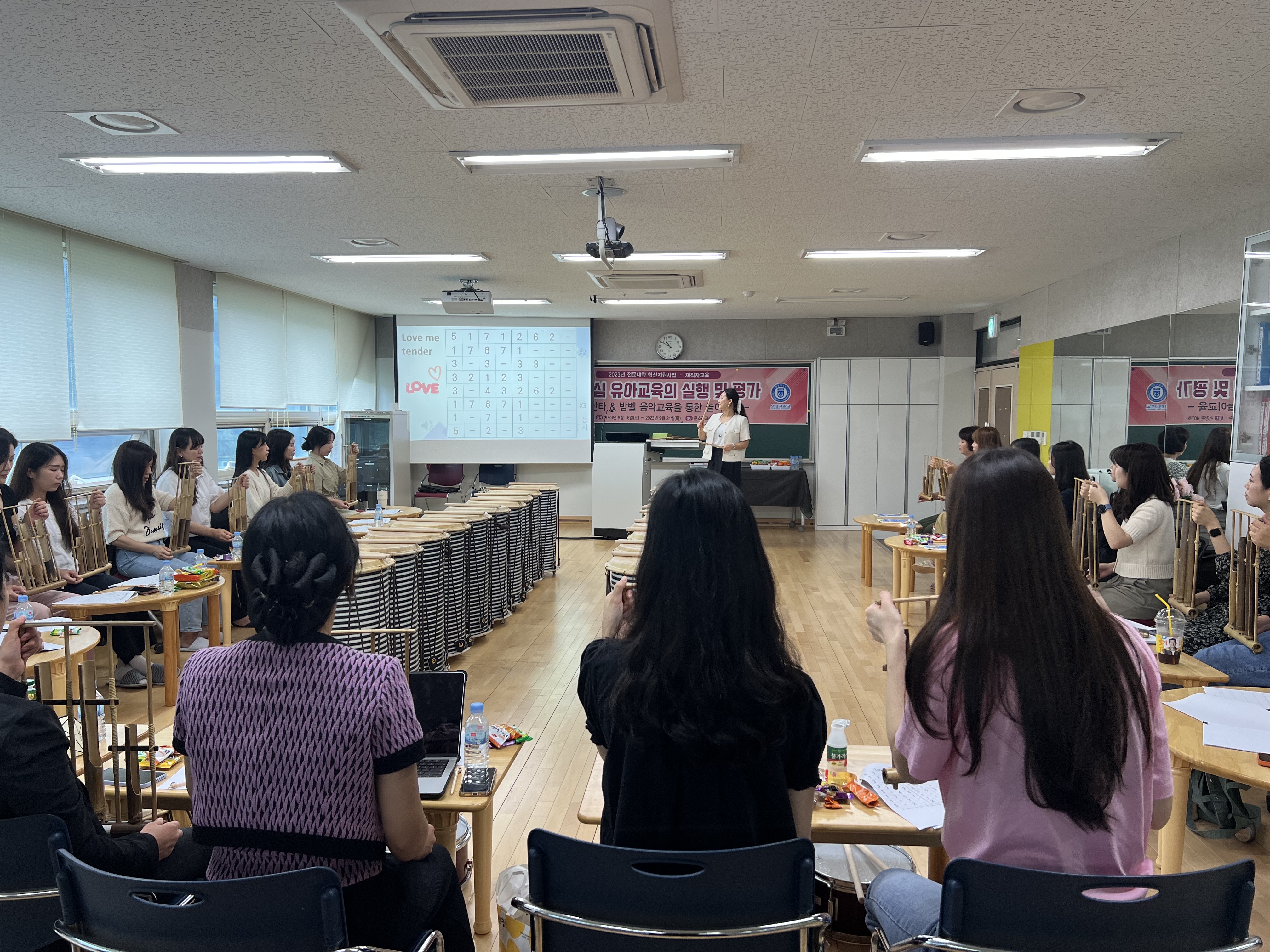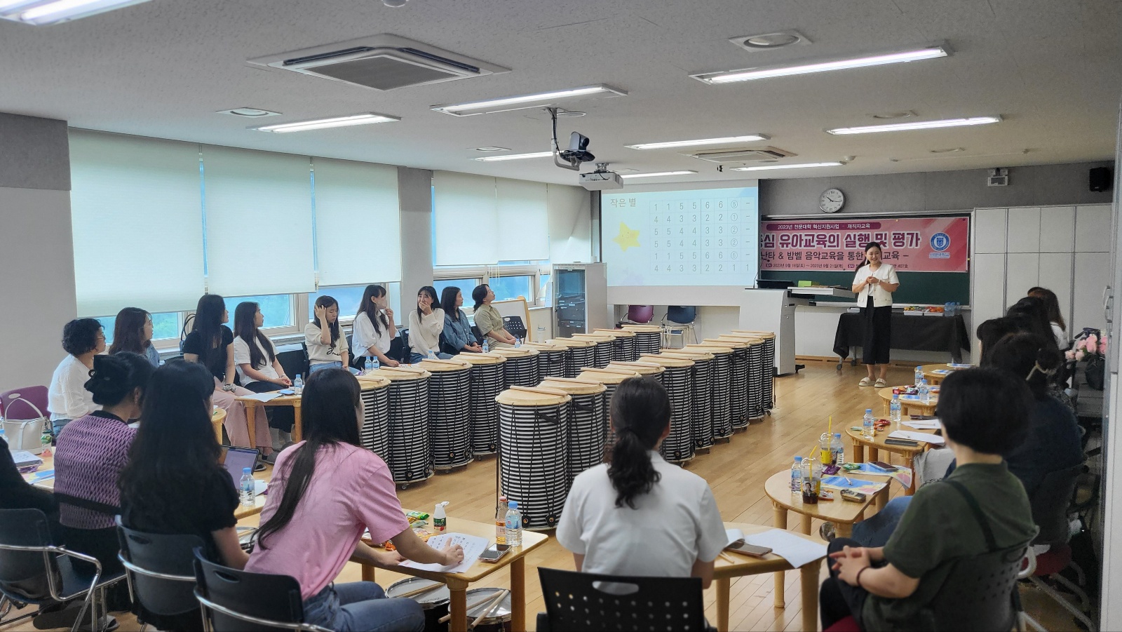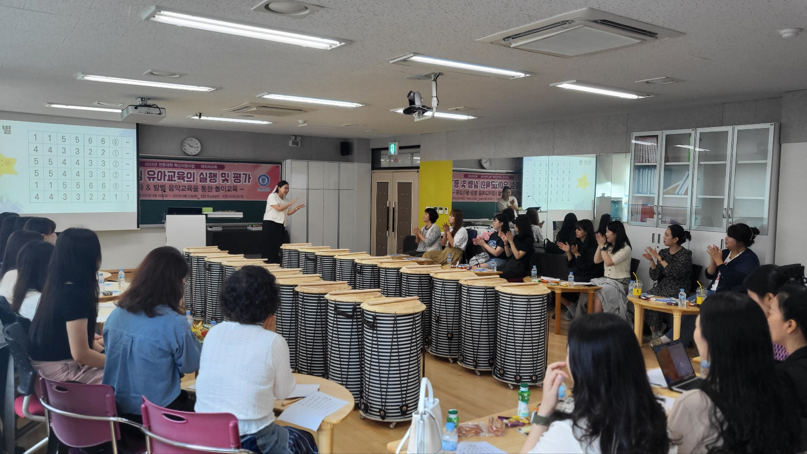 - 내용 : 9/16 (토) '놀이중심 유아교육의 실행 및 평가' 주제로 영유아교육기관 재직자들을 위한 특강을 실시하였습니다. 특강은 놀이중심 유아교육의 이론적 기초에 대한 강의를 시작으로 놀이중심 유아교육지원을 위한 음악 놀이 사례연구(유아 난타 북과 앙클루 악기를 활용한 놀이교육의 실제) 및 놀이중심 유아교육 평가법의 연구 순서로 진행되었습니다.