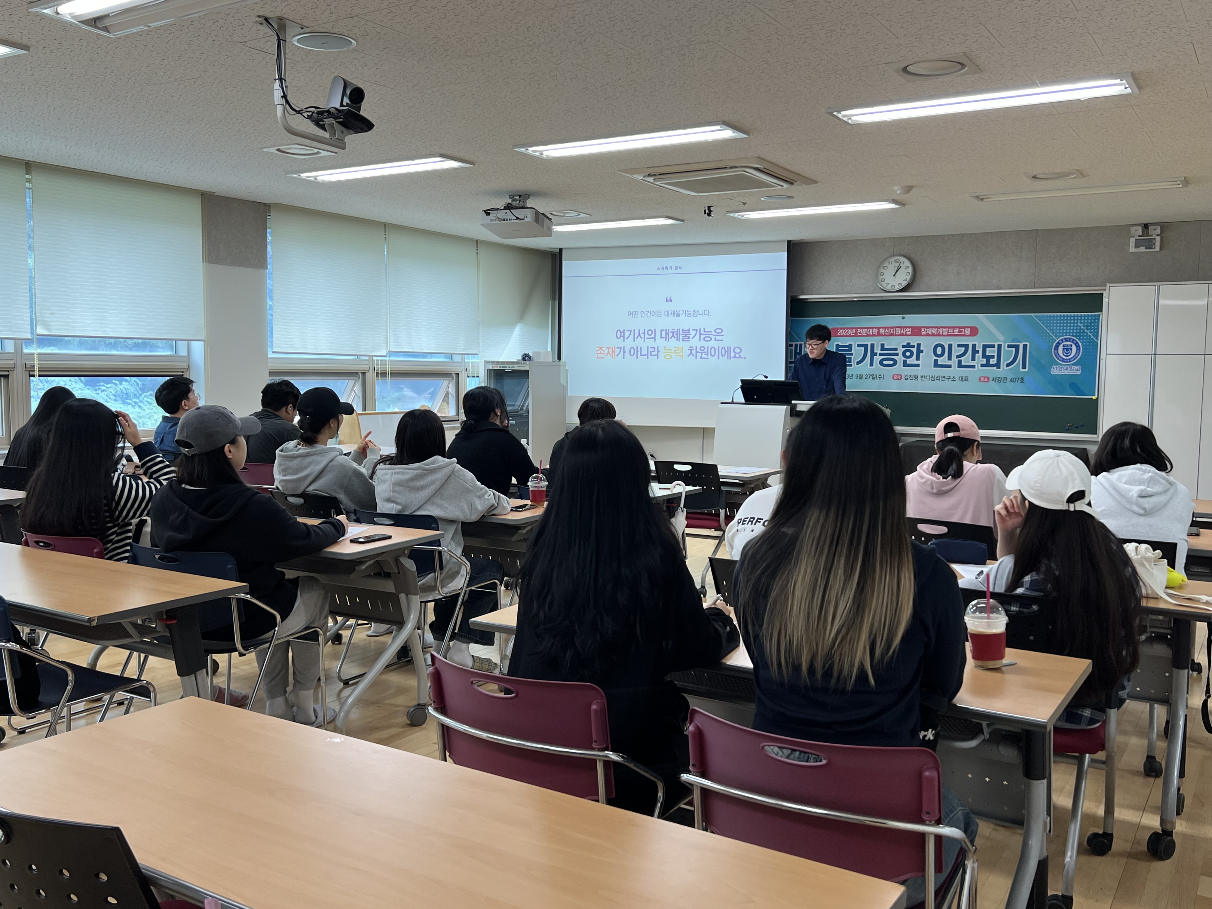 - 내용 : "어떤 인간이든 대체 불가능하다" 여기서 대체불가능은 존재가 아니라 능력의 차원이다. 특강을 통해 내면에 존재하고 있는 존재적 불안감, 창의력, 학습화된 무기력, 자기결정론, 상상력 등에 대해 이야기를 나누었다. 일방적인 강의식 특강이 아닌 학생들과의 소통을 중요시하며, 개방적 발문으로 질문에 대한 다양한 답들을 유도하여 특강을 진행해주셔서 스스로의 내면을 생각해보고 이해할 수 있는 계기가 되었다.
