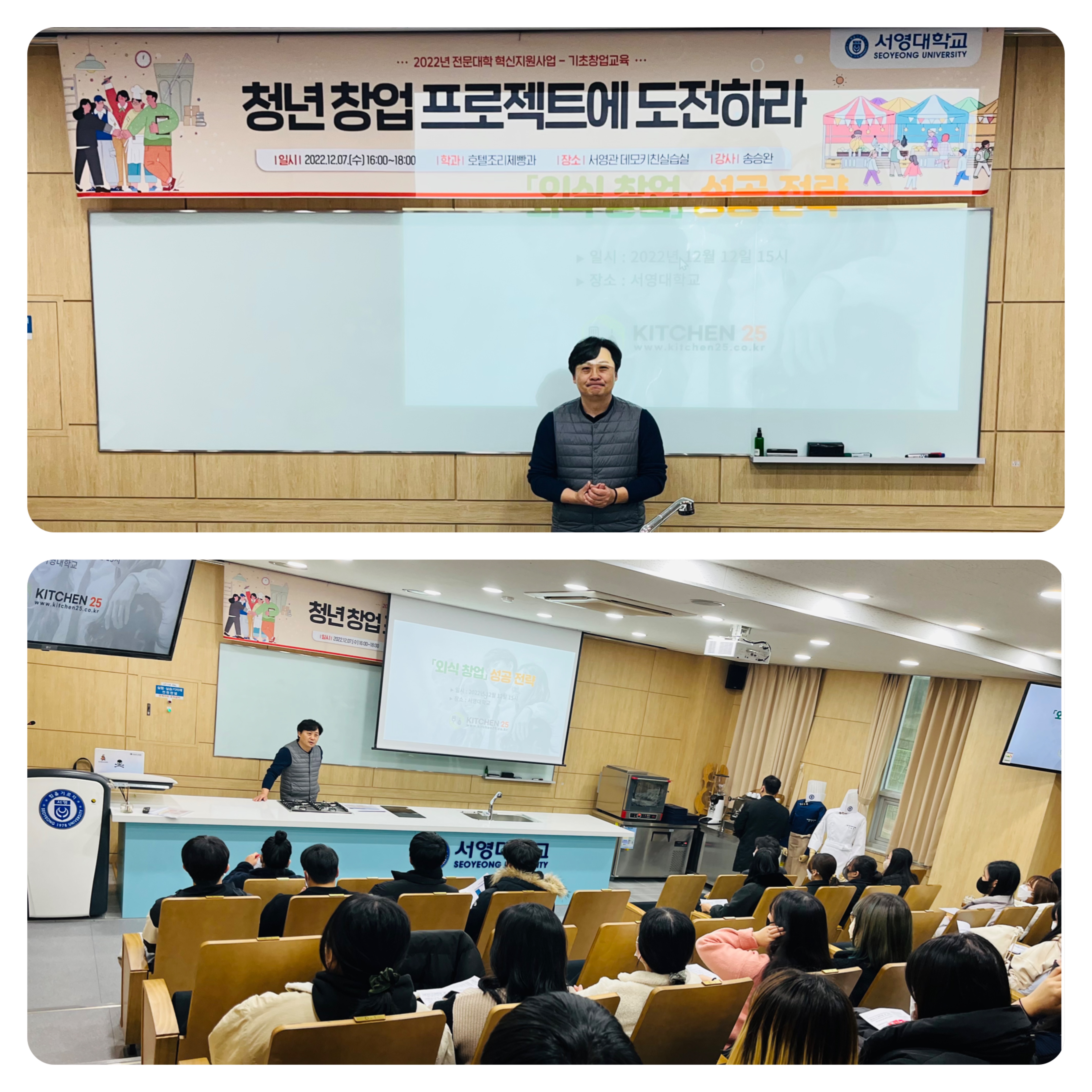 ○ 호텔조리제빵과(학과장 권기완)는 12월07일 서영관 데모키친실습실에서 재학생 60여명을 대상으로 창업특강 및 채용설명회를 실시하였다.