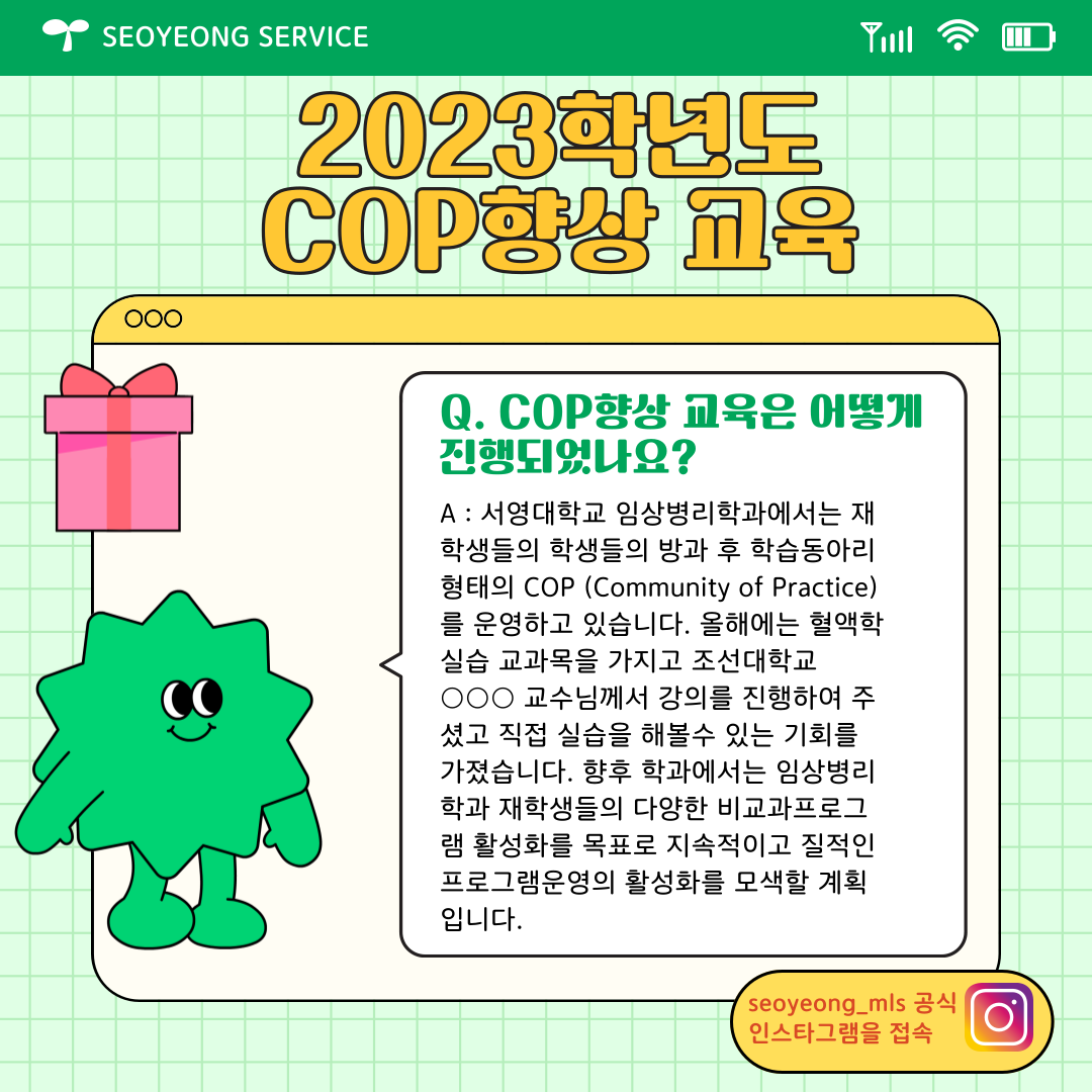 서영대학교 임상병리학과에서는 재학생들의 학생들의 방과 후 학습동아리 형태의 COP (Community of Practice)를 운영하고 있습니다. 올해에는 혈액학 실습 교과목을 가지고 조선대학교 ○○○ 교수님께서 강의를 진행하여 주셨고 직접 실습을 해볼수 있는 기회를 가졌습니다. 향후 학과에서는 임상병리학과 재학생들의 다양한 비교과프로그램 활성화를 목표로 지속적이고 질적인 프로그램운영의 활성화를 모색할 계획입니다.