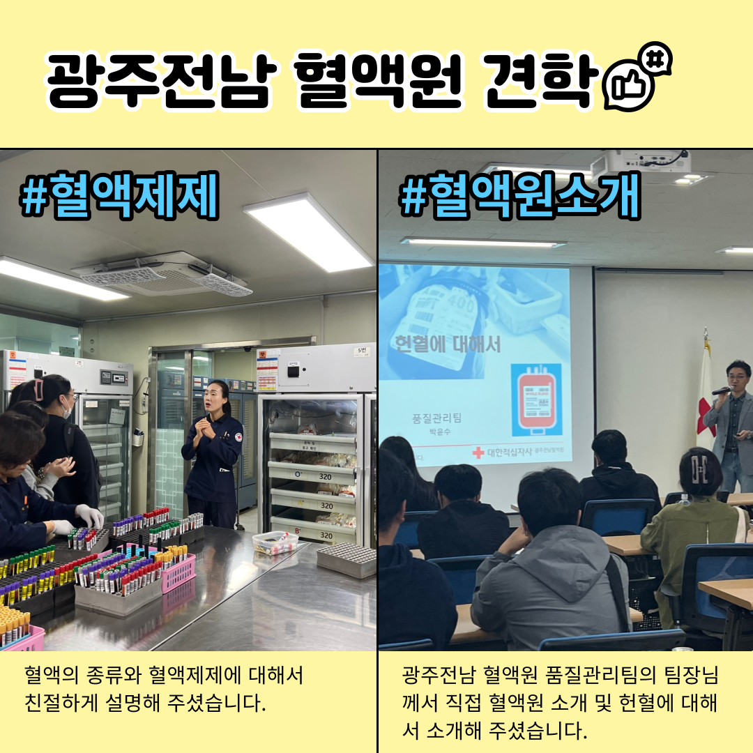 ○ 우리대학 임상병리과1학년 재학생을 대상으로 대한적십자사 광주전남혈액원 현장견학 프로그램을 실시했다. ○이번 견학은 임상병리과1학년 학생들의 전공학습역량강화를 위한 비교과 프로그램의 일환으로 광주전남혈액원을 방문하여 혈액제제 제조부,혈액공급부 등의 업무과정을 참관하며 그 역할과 기능을 이해하는 시간으로 마련됐다. ○조영국 임상병리과 학과장은“혈액원의 핵심 업무를 이해하고 채혈부터 혈액공급까지의 과정을 임상병리사의 시각에서 바라볼 수 있는 의미 있는 시간이 됐을 것”이라며“앞으로도 다양한 현장견학 프로그램을 마련해 임상병리사의 다양한 직무와 역할을 배울 수 있는 기회를 제공하겠다”고 전했다. ○한편 대한적십자사 광주전남혈액원은1949년 설립되어 광주전남지역 재해 이재민과 취약계층을 위한 긴급구호 활동,노인·장애인·다문화가정·저소득층 등을 대상으로 한 사회봉사활동,헌혈운동 등 인도적 사명을 수행하고 있다.
