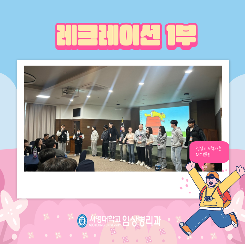 최강임상학생회가 알차게 준비한 레크레이션 시간을 시작으로 다양한 레크레이션 프로그램을 통한 최강임상 학우들의 멋진 모습들을 선보여졌고,