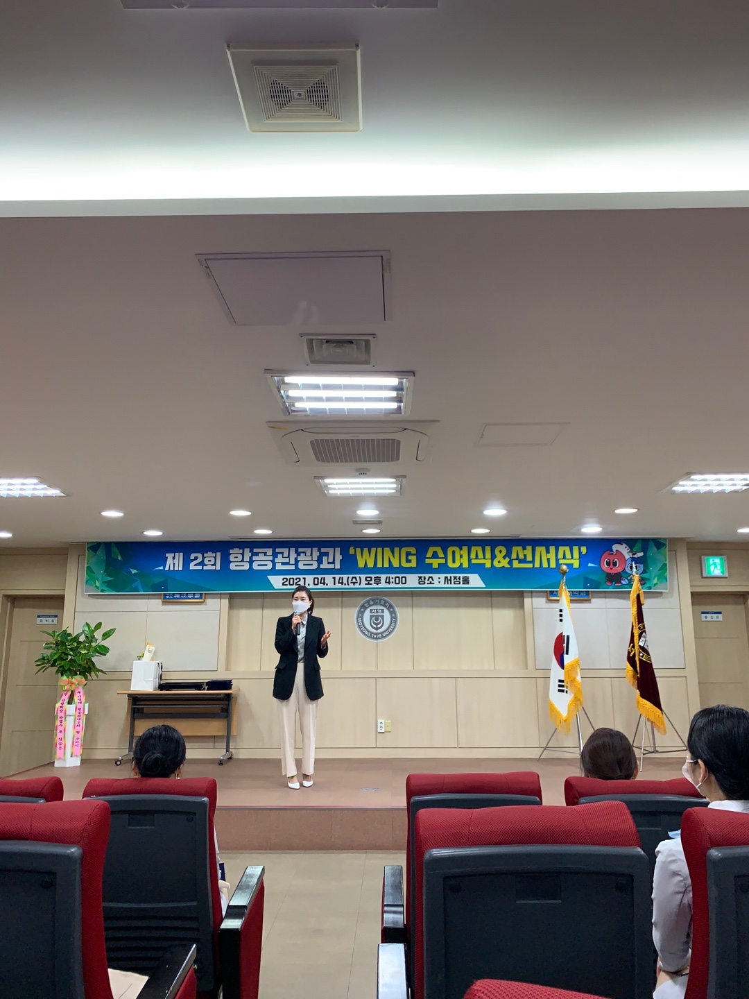 1학년 신입생 대표가 선서식을 하고 20학번 선배들이 21학번 후배들에게 직접 윙을 달아주며 항공관광과의 일원으로 각오를 다지는 뜻깊은 시간을 가졌습니다.