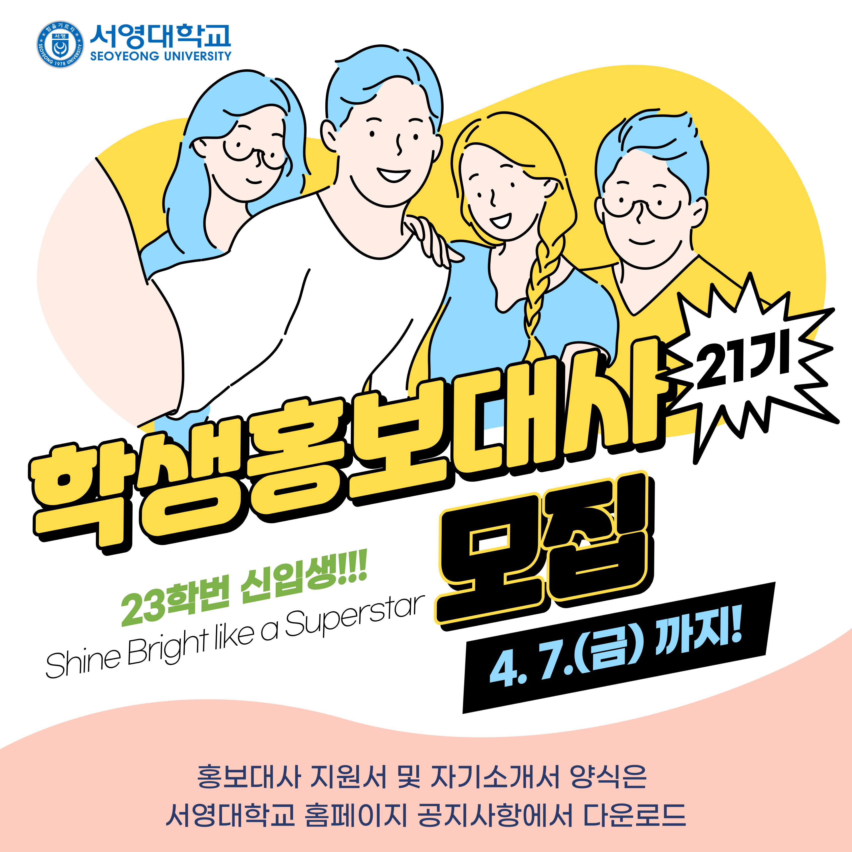 ■ 접수기간 및 방법 - 2023.03.20 (월) ~ 04.07 (금) - 제출서류 ( 첨부파일 참조 ) 1. 홍보대사 지원서 1부 2. 홍보대사 자기소개서 1부 3. 반명함판 사진1매 (지원서에 부착) 제출/접수처 : 서정관 대학본부 4층 입학홍보처