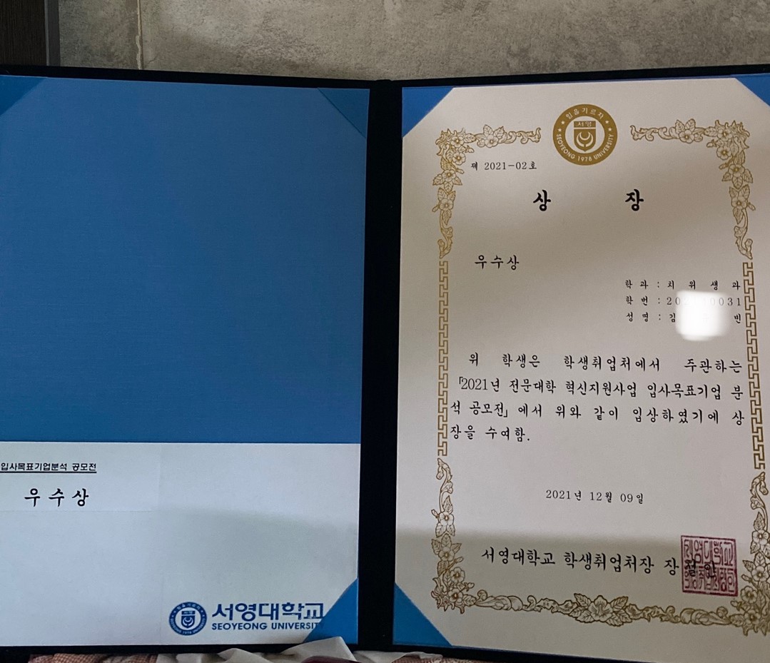 치위생과 김O빈 학생이 우수상을 수상하였습니다.