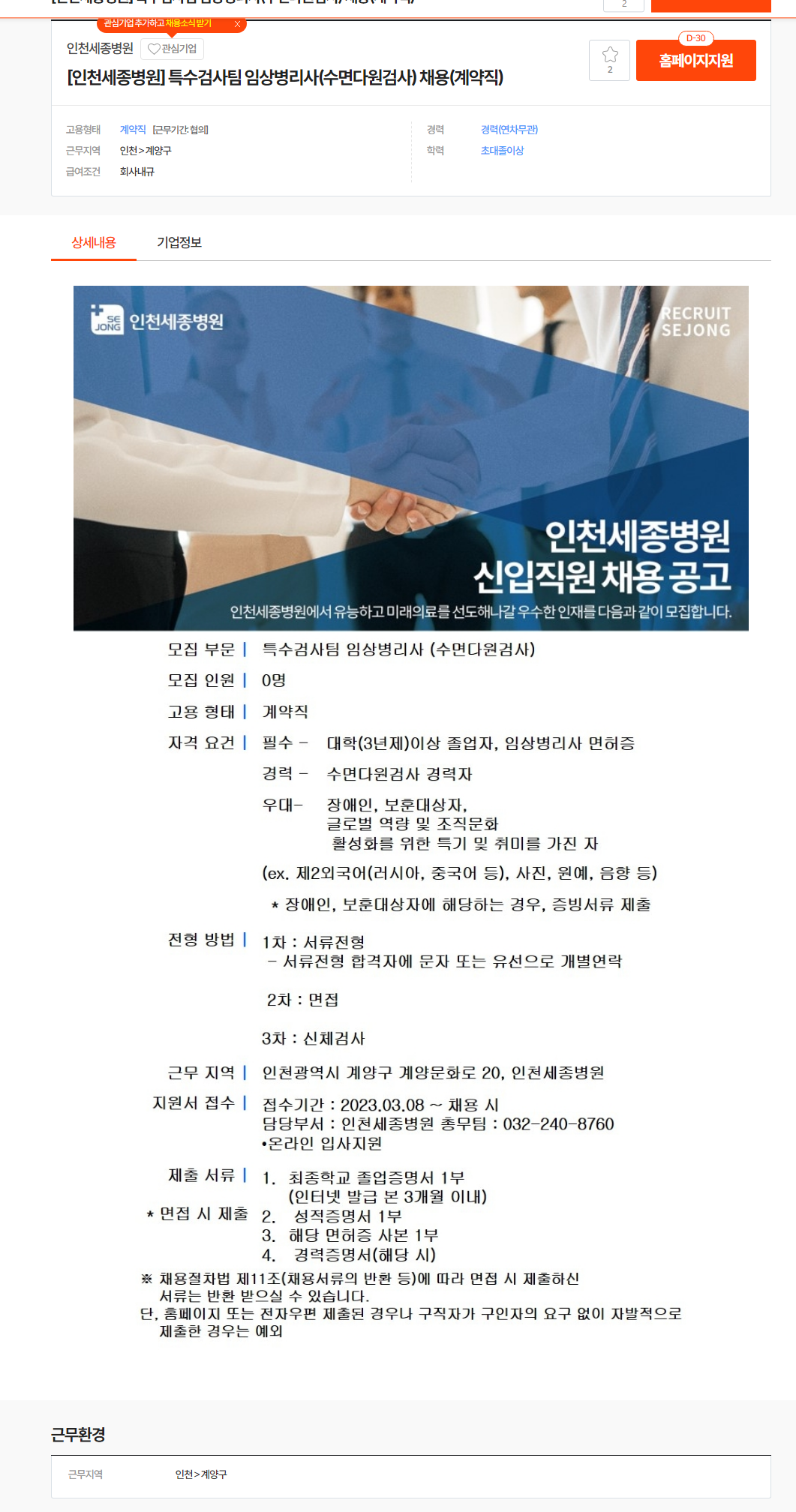 인천세종병원 채용 : [인천세종병원] 특수검사팀 임상병리사(수면다원검사) 채용(계약직) - 인크루트 채용정보 (incruit.com)