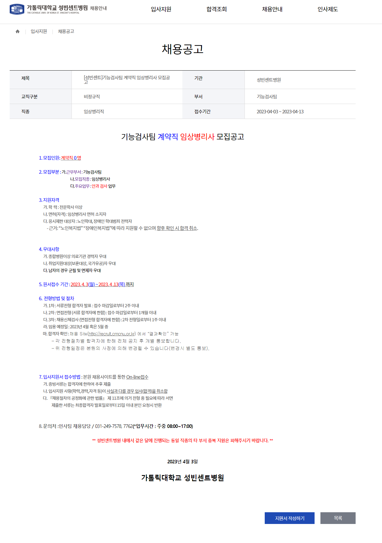 채용공고 - 입사지원 - 가톨릭대학교 성빈센트병원 일반채용 (cmcnu.or.kr)