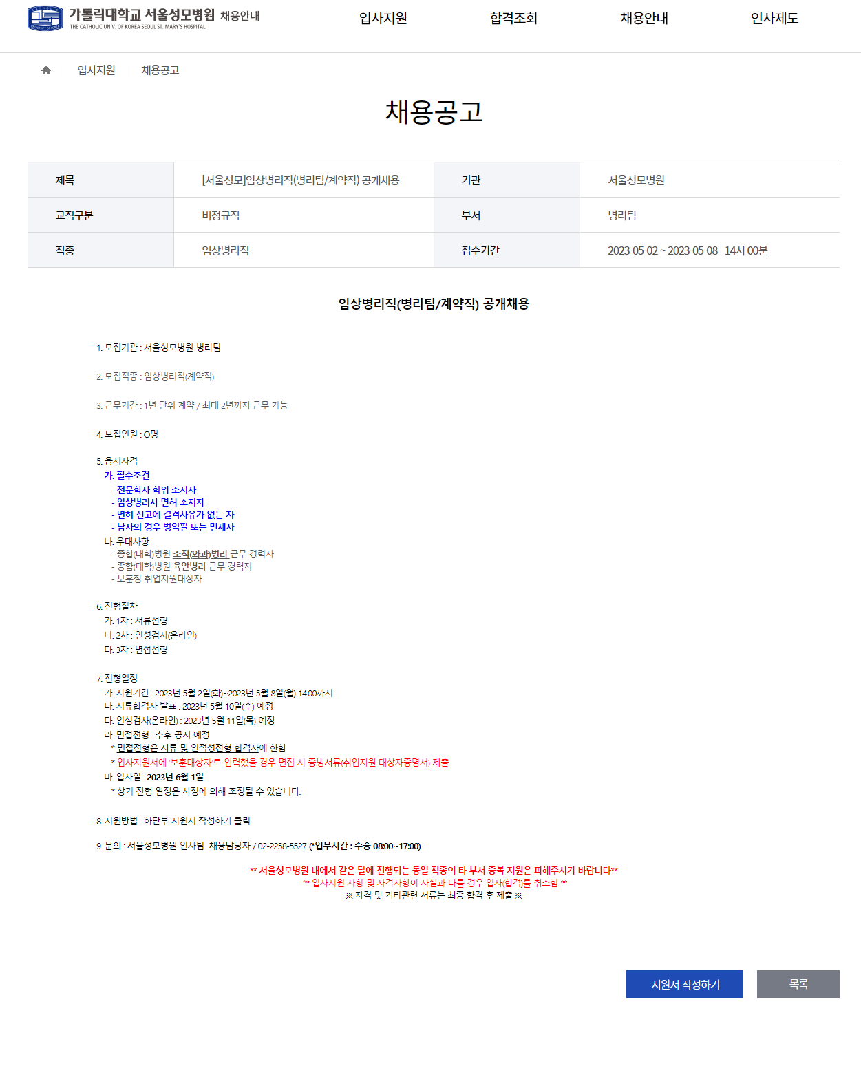 입사 지원: 채용공고 - 입사지원 - 가톨릭대학교 서울성모병원 일반채용 (cmcnu.or.kr)