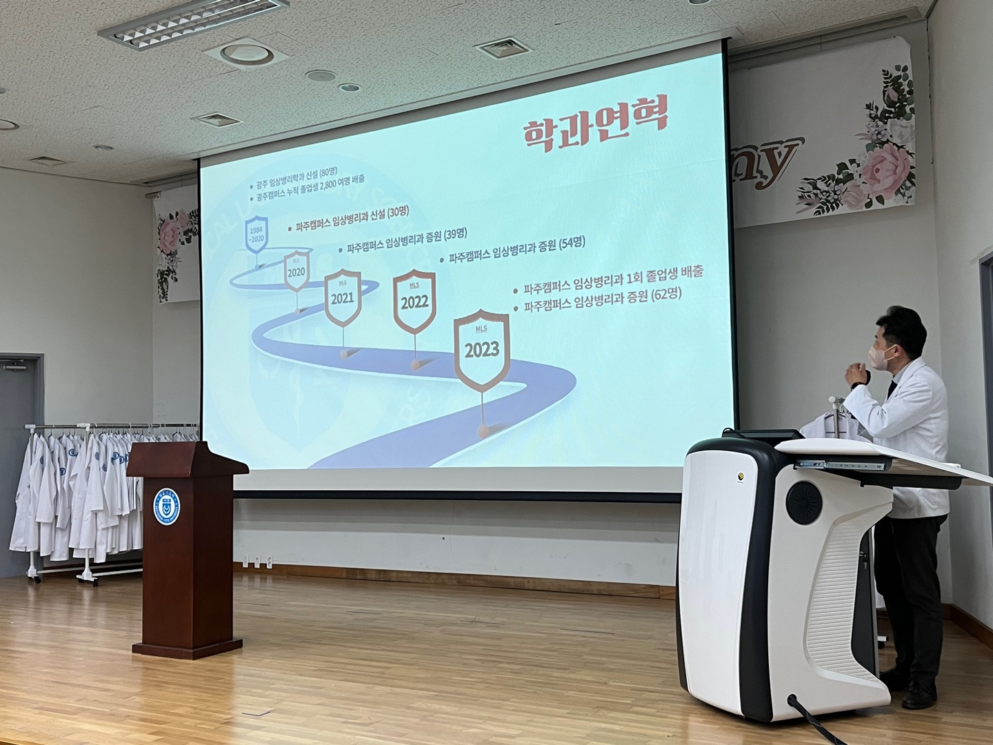 또한, 임상병리학과장 이지웅교수는 2020년도 학과의 신설 이래 성장사를 전하며 "23학번 신입생 여러분의 입학을 진심으로 축하하고 여러분들이 의생명과학자로 성장할 수 있도록 앞으로도 학과교수진은 최선을 다하겠다"는 인사말을 전했다.