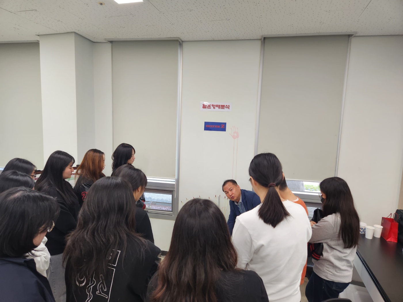 과학 수사 체험교실에서 법인류학 개요, 혈흔형태분석, 지문감정, DNA분석, 법최면· 몽타주, 프로파일링, 문서감정, 폴리그래프 등의 분야에 대한 다양한 수사기법 교육 및 실습이 2시간 가량 진행되었다. 이 날 교육을 위해 경기북부경찰청 과학수사팀에 재직 중인 김영삼 팀장님이 수고해주셨다.