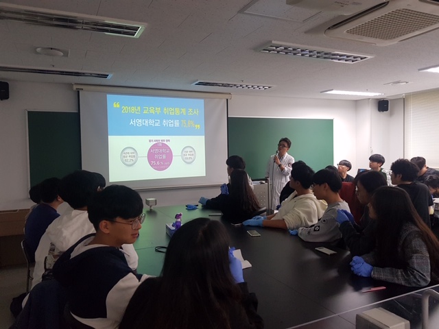지난 10월 19일(토) 서영대학교 파주캠퍼스 임상병리과는 산학 협약을 맺은 고려대학교 분자진단연구회와 함께 서울시 도봉구 관내 6개 고등학교에서 130여명의 학생들이 참여한 가운데 도봉구와 함께하는 ‘생명과학체험교실’을 개최하였다. 청소년 ‘생명과학 체험 프로그램’은 일반 고등학교의 기자재로는 체험이 어려운 ‘DNA 지문분석 (DNA finger printing)’ 기법등과 같은 실험을 대학교 실험실에서 직접 체험해 볼 수 있도록 하는 기회를 통해 청소년 스스로의 자신의 적성을 찾아가고, 4차 산업혁명에 대응할 수 있도록 하기 위해 마련됐다. 특히, 서영대학교 파주캠퍼스 임상병리과 이지웅 학과장은 “바이오, 인공지능, 빅데이터, 의생명과학 등의 융합이 어우러지는 4차 산업혁명 시대를 맞이하면서 학생들이 직접 다양한 실험을 경험 할 수 있는 ‘청소년 생명과학 체험 프로그램’을 통해 과학기술을 선도할 수 있는 인재로 성장하는 기회가 되길 바란다며 그러한 인재들이 꿈을 키워 나갈수 있는 서영대학교 파주캠퍼스 입시 홍보 및 임상병리과의 비전에 대해 강의하였다.