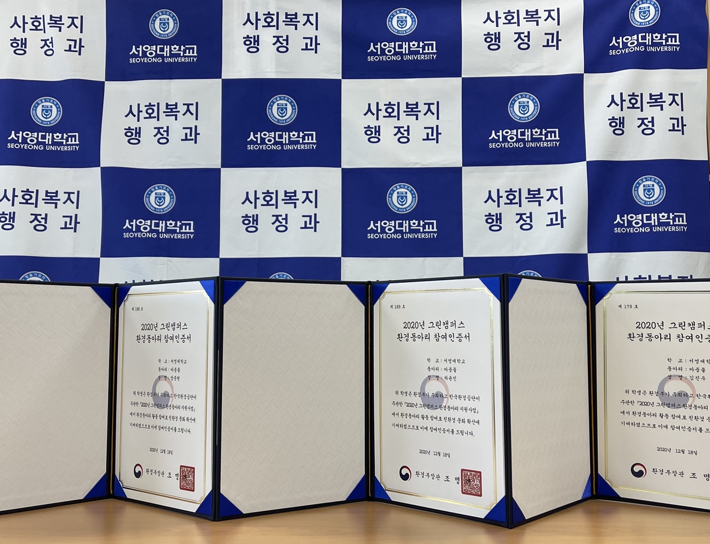 사회복지행정과 '마중물'은 환경부가 주최하고 한국환경공단이 주관한 2020년 그린캠퍼스 환경동아리 지원사업에서 환경동아리 활동 참여로 친환경 문화 확산에 기여하였으며 이에 대한 참여인증서를 수여했습니다.