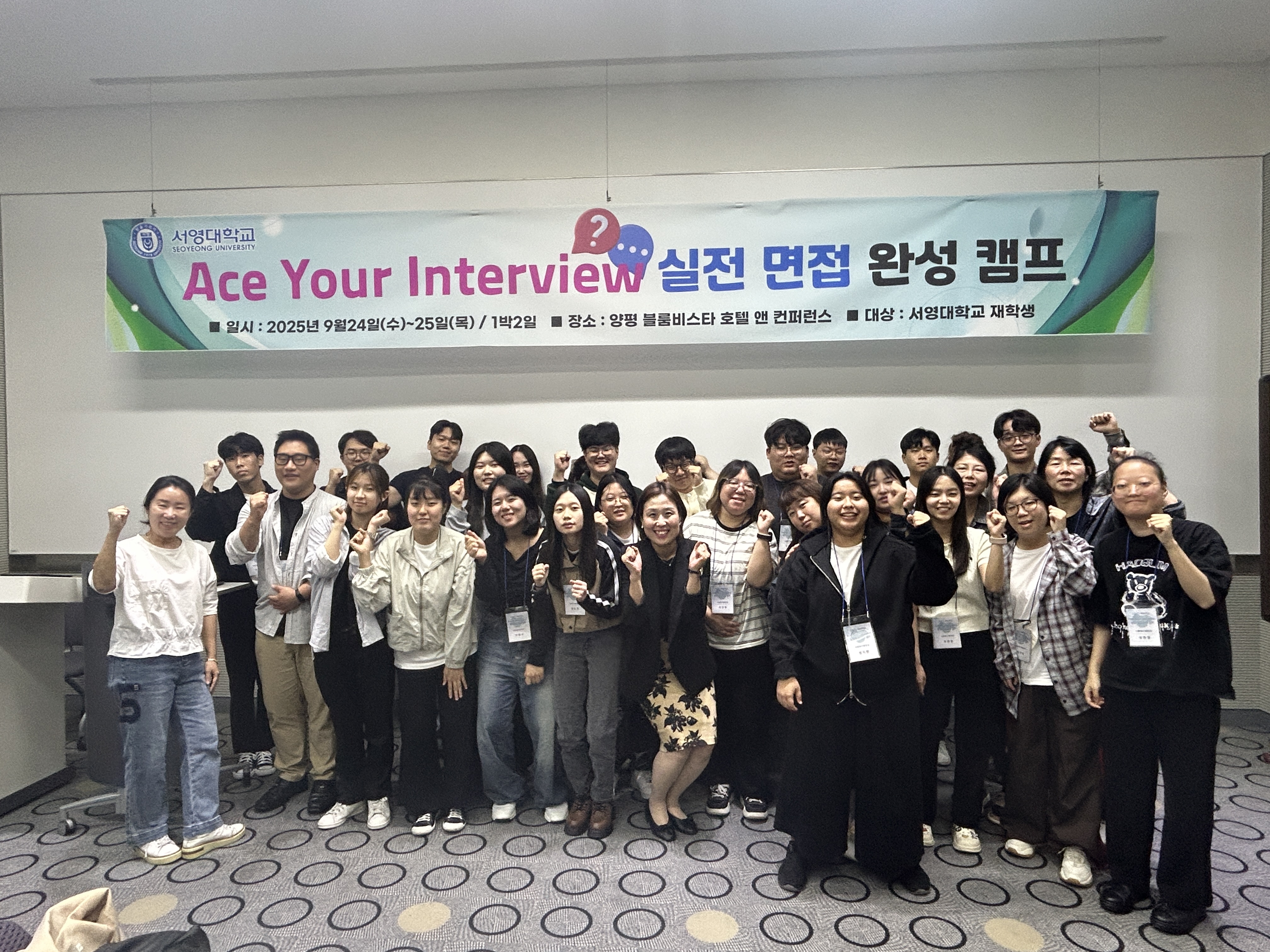 ○ 우리대학(총장 김정수)은 2025년 9월 24일(수) ~ 25일(목) 1박2일 일정으로 양평 블룸비스타 호텔 앤 컨퍼런스에서 취업역량강화캠프를 실시하였다. 이번 캠프는 채용 시장의 최신 흐름을 이해하고 다양한 면접 유형을 경험함으로써, 학생들이 취업 준비 방향을 명확히 설정하고 면접 실전 능력을 강화기 위하여 기획된 프로그램이다.